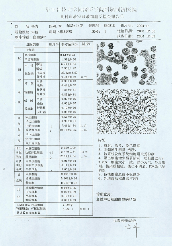 楊青血液細(xì)胞學(xué)檢查報(bào)告單(圖)