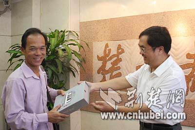 來(lái)自赤壁的幸運(yùn)讀者接受江總編輯頒發(fā)的獎(jiǎng)品,這位龍先生非常高興,他說(shuō)他的手機(jī)正好該換了,沒(méi)想到運(yùn)氣這么好得到一部這么好的手機(jī)。