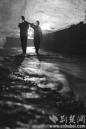 寂寞的蝙蝠第一次接待了人間來客,沉睡萬年的巖溶洞穴第一次迎來了觀者。但黑暗陌生的世界還是讓堂堂男兒們感覺了一絲陰森恐怖。他們曾聽當?shù)匕傩諅髡f,洞里有巨蟒,所以至今沒人敢進洞!白ゾo時間測量!”來不及恐懼,他們?yōu)樽约汗膭,因為這里隨時可能發(fā)生漲水、墜落等危險?上,第一次經(jīng)驗不足,手電筒的電池很快用完了,一行人只得互相攙扶著,摸索出溶洞!昂髞恚覀冇诌M去了7次,終于測出了暗河的具體位置和流向!狈轿奈湔f。