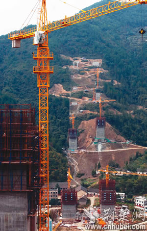 龍?zhí)逗犹卮髽蚓o鄰長陽縣榔坪鎮(zhèn),是滬蓉西高速公路上一座T構箱梁橋,主橋墩最高178米,居世界同類橋高墩之最!耙娺^這么高的塔吊沒?”戴上安全帽,湖北路橋公司項目經(jīng)理夏君華帶記者一行踏訪工地。