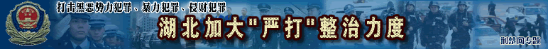湖北今年嚴(yán)打目標(biāo)確定 省公安廳透露,去冬今春,我省社會治安大局穩(wěn)定,刑事發(fā)案率有所下降,今年將加大嚴(yán)打整治力度,重點(diǎn)打擊黑惡勢力犯罪、暴力犯罪、侵財(cái)犯罪……[詳細(xì)]::武漢警方突襲濱江明珠娛樂城 抓獲45名吸毒者 ::全省交警嚴(yán)查盜搶車 一假警車上查處9塊假車牌::湖北圈定106個(gè)治安整治重點(diǎn) 武漢市5個(gè)地段在列 武漢嚴(yán)打建筑工地惡勢力 [市政法委 各區(qū)舉報(bào)電話][把黑惡勢力趕出工地訪談熱線開通]::武漢市政法委副書記:廣泛發(fā)動(dòng)群眾鏟除沙霸石霸::漢陽鏟除沙石惡霸團(tuán)伙 行兇兩年作惡無數(shù)(圖)