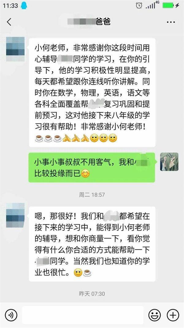 2021年的第一次線上志愿輔導(dǎo)在我的激動、欣喜、緊張交錯之中開始了。第一步也是最重要的一步:和家長進(jìn)行交流與溝通。說實話,我的心里還是非常忐忑的:害怕家長不回復(fù)消息,害怕不能很好地了解小朋友的學(xué)習(xí)狀況。但其實邁出溝通的第一步之后,后面的對話就很自然了,并沒有想象中的那么困難和緊張。而且很幸運的是,家長很配合我們的輔導(dǎo)活動,我的心里瞬間就放松了不少,自信心也莫名大增!被叫老師,真是很久違的感覺,令我成就感倍增,獲得了家長的稱贊也讓我很開心。而我本身也很喜歡數(shù)學(xué),希望我的興趣可以感染到小朋友,讓她也能喜歡數(shù)學(xué)。也希望通過基本的閱讀寫作教學(xué),讓她能夠提升自己。