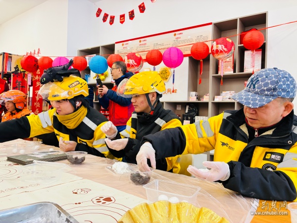 活動現(xiàn)場,手工DIY區(qū)準(zhǔn)備了糯米粉、黑芝麻餡、豆沙餡等原材料,黃鶴樓消防站的消防員與外賣騎手、快遞員們圍坐在一起,揉面、包餡、搓圓,體驗親手制作湯圓的樂趣。