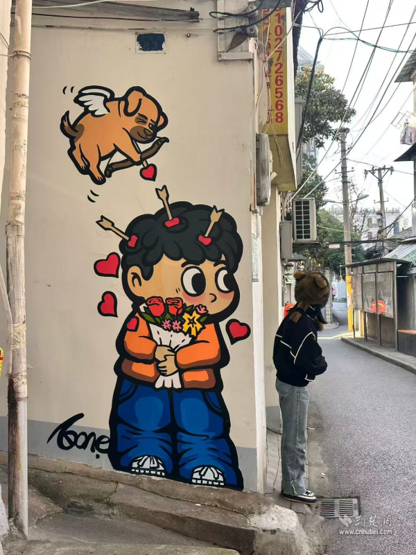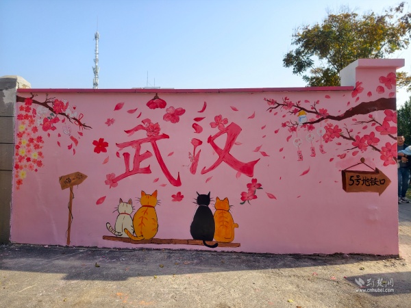 走出彭劉楊路地鐵B2口,來到社區(qū)八卦井旁,一面粉墻惹人注目,櫻花飛揚(yáng)、四只貓咪相依蹲坐。在社區(qū)攜手武漢學(xué)院藝術(shù)與傳媒學(xué)院青年志愿者開展的“墻上生花,美在西廠”主題活動中,10余名青年志愿者用畫筆和創(chuàng)意,打造出這面繪有櫻花和貓咪的“武漢”主題墻。