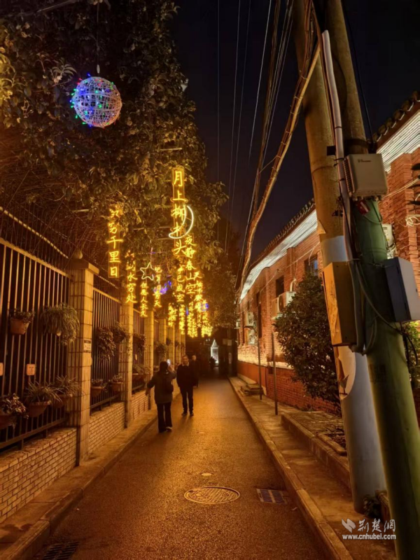 這個由社區(qū)與共建單位湖北省農(nóng)業(yè)事業(yè)發(fā)展中心共同策劃改造的“詩詞長廊”,創(chuàng)新融合了詩詞文化與光影藝術(shù)。夜幕降臨,一盞盞詩詞燈帶悄然亮起。柔和光暈下,“晴川歷歷漢陽樹,芳草萋萋鸚鵡洲”的古韻與墻上“蒜鳥”“七飯”等俏皮的武漢方言點(diǎn)綴其間,歷史與當(dāng)下在光影交錯間完成了隔空對話。