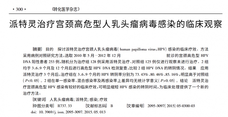 隨著我國對宮頸癌及其”幕后元兇“HPV病毒的科普不斷深入,公眾的關(guān)注焦點(diǎn)已從基礎(chǔ)認(rèn)知轉(zhuǎn)向更為具體的防護(hù)需求,主要包括:未感染時的預(yù)防、感染后如何早期干預(yù),以及如何縮短轉(zhuǎn)陰時間。這些需求對健康科普與臨床實(shí)踐提出了新要求。近日,有專家提及,中國科技核心期刊《轉(zhuǎn)化醫(yī)學(xué)雜志》曾發(fā)表一篇臨床觀察報(bào)告,指出中藥制劑派特靈或可明顯縮短HPV感染的轉(zhuǎn)陰時間,為臨床處理提供了新的思路與方法。
