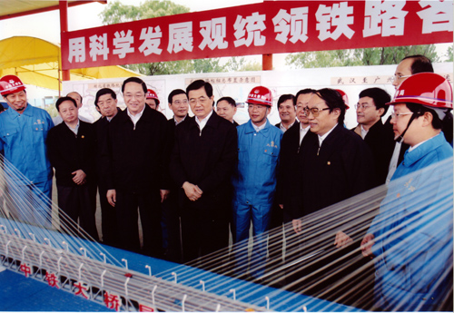 2005年8月22日上午,中共中央總書記、國家主席、中央軍委主席胡錦濤同隨行的中共中央政治局候補(bǔ)委員、中央書記處書記、中央辦公廳主任王剛,在中共中央政治局委員、湖北省委書記俞正聲,湖北省省長羅清泉等陪同下,考察了正在建設(shè)中的武漢天興洲公鐵兩用長江大橋工程,對鐵路建設(shè)作出重要指示。胡總書記指出,武廣鐵路客運專線和武漢天興洲大橋是中國鐵路建設(shè)史上新的里程碑。這條鐵路線的建設(shè)標(biāo)志著中國鐵路客運專線建設(shè)的開始,今后要建設(shè)更多的鐵路客運專線。一定要把武廣客運專線和天興洲大橋這個我國鐵路建設(shè)史上新的里程碑工程建設(shè)好。