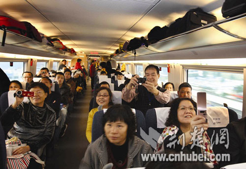 荊楚網(wǎng)消息 (楚天金報記者譚新杰 通訊員郭金富、劉強(qiáng))12月26日上午9時,三列嶄新的時速350公里“和諧號”高速列車從武漢站、長沙站和廣州北站同時首發(fā),標(biāo)志著目前世界上運(yùn)營速度最快、一次性建成里程最長的高鐵新干線——武廣客專正式投入運(yùn)營。“陸地飛行下廣州,千里南國一日還”的時代已經(jīng)到來。